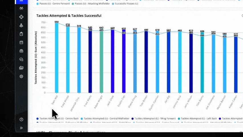 - Filter by tactical action type: passes, tackles, duels, recoveries, presses, involvements