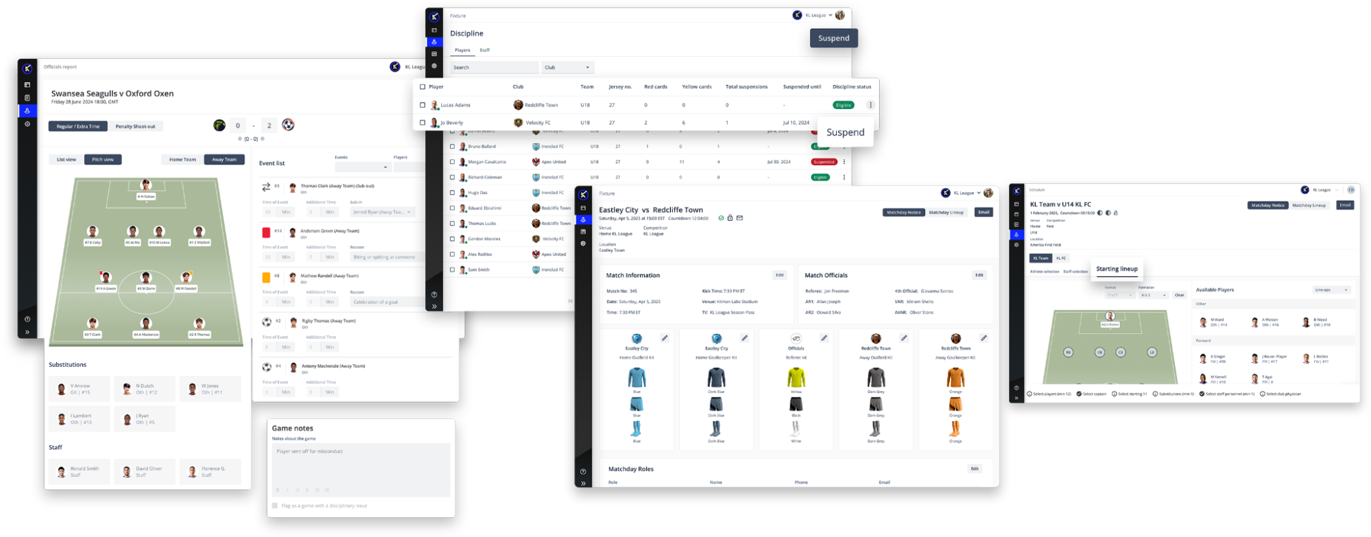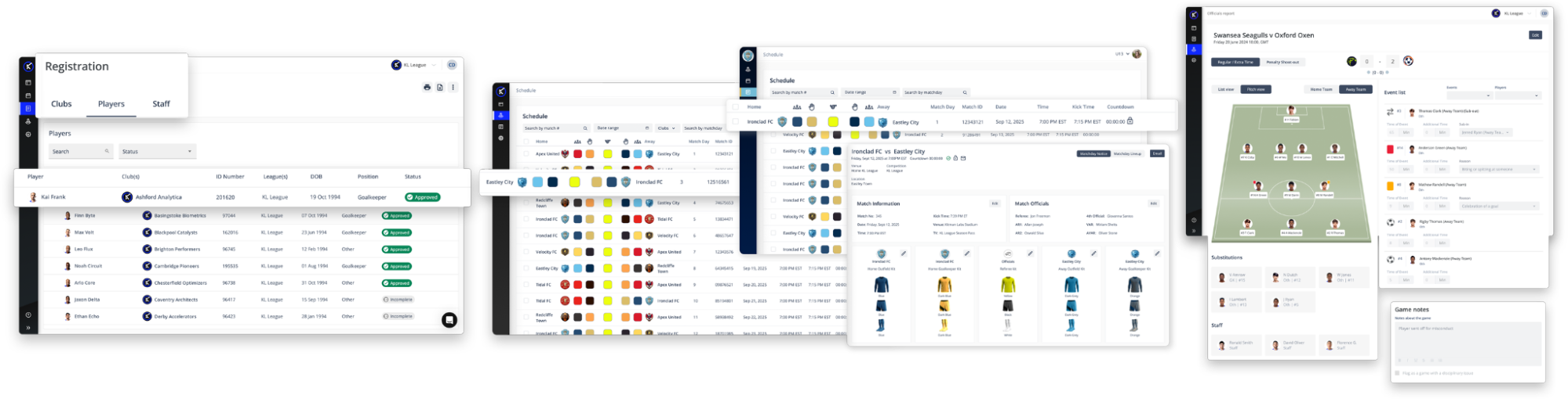 - Real-time dashboards across fixtures, lineups, and compliance status
