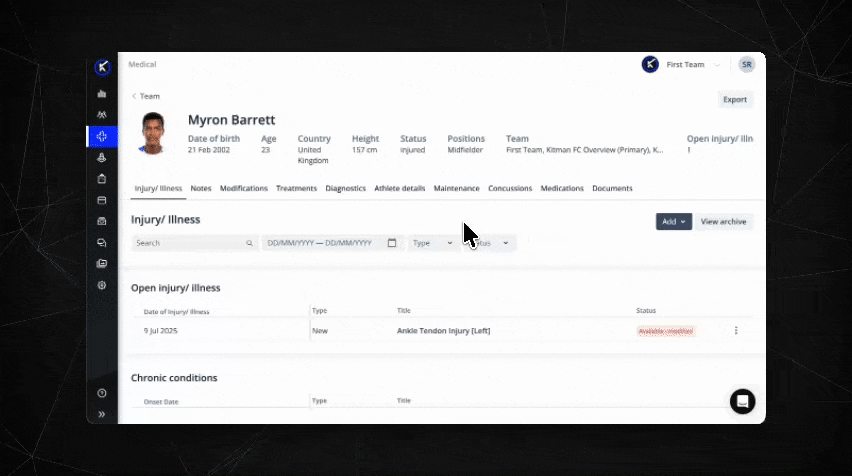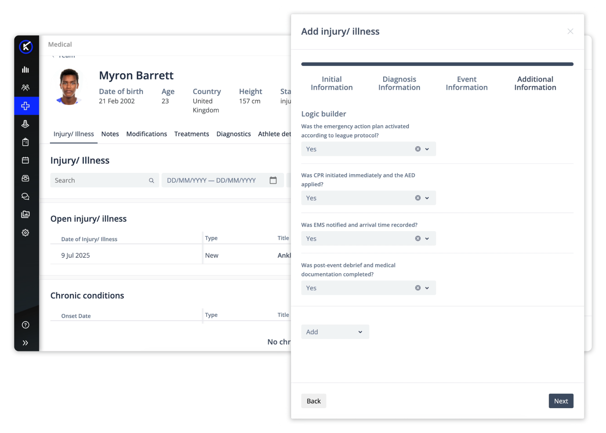 Because Logic Builder operates at the injury level, each workflow links directly to the athlete’s injury or illness record, providing context and continuity across the full medical history.